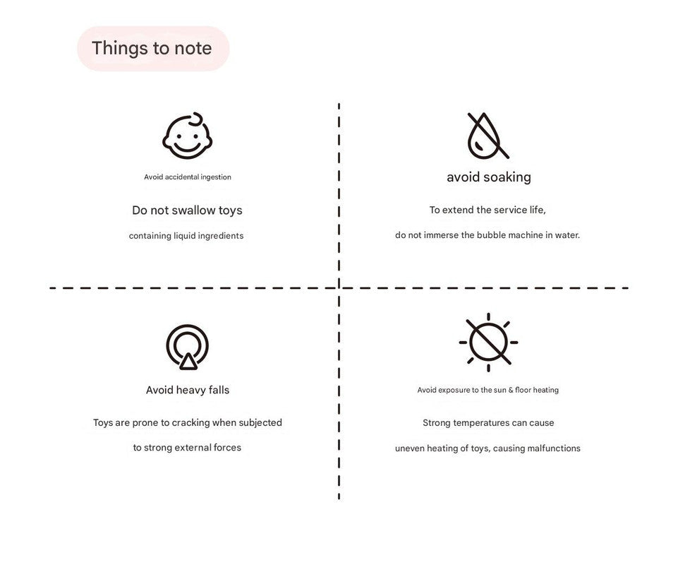 - Refill Bubble Solution: When the bubble solution is used up, please refill with the manufacturer-provided solution to ensure proper product function. Do not use other self-configured liquids.
