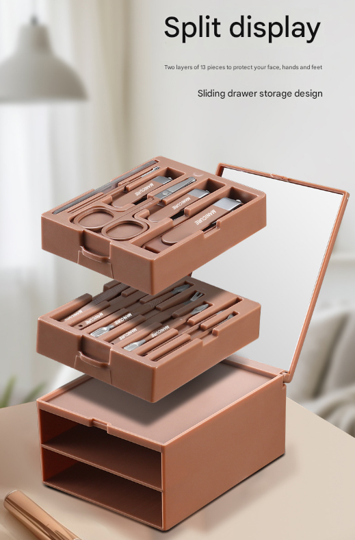 Achieve salon-quality results from the comfort of your home with this comprehensive 13-in-1 Manicure and Grooming Kit. Housed in a cleverly designed dual-drawer case with a built-in mirror, this set contains everything you need for complete hand care, foot care, and facial grooming. It is the perfect all-in-one solution for maintaining a neat and polished appearance.